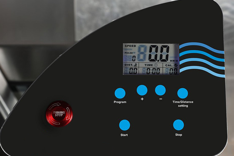 Il display di comando è di semplice ed intuitiva impostazione e gode di 4 programmi predefiniti, ha inoltre un tasto di emergenza a pressione per interrompere rapidamente il movimento del tappeto.